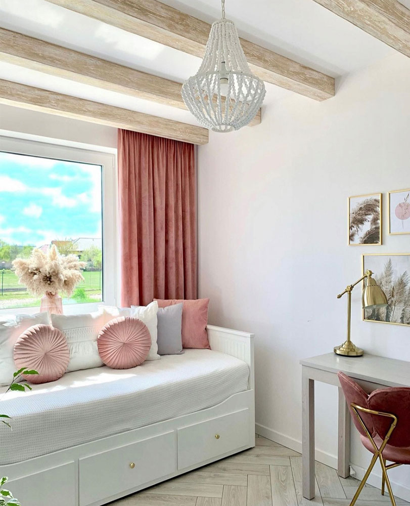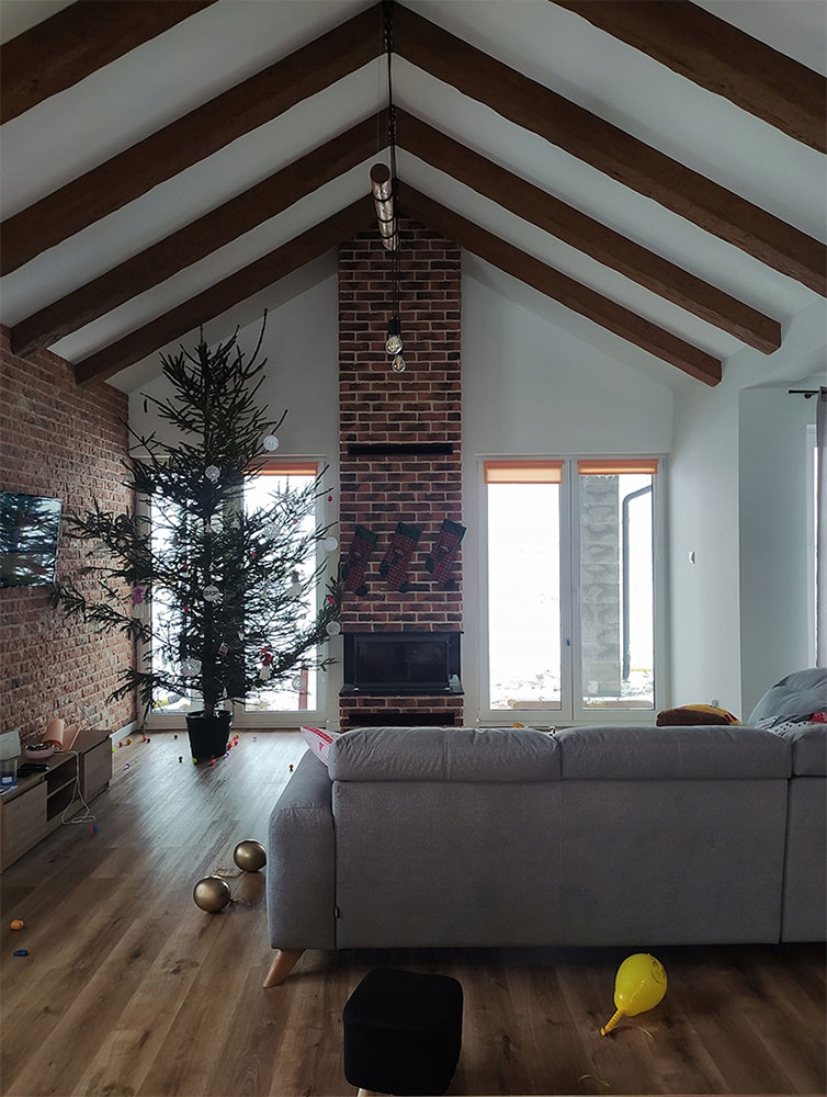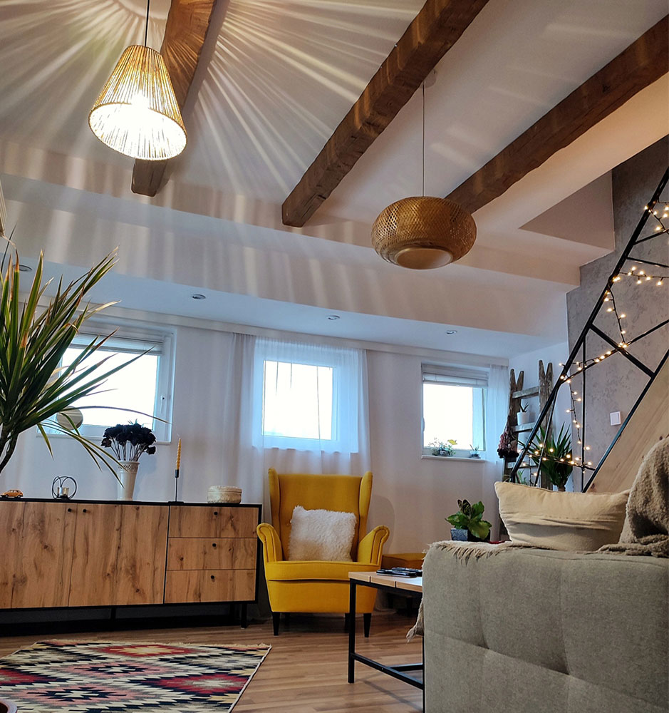 4. Visuele interesse en structuur: Houten balken kunnen dienen als een visuele focuspunt in een ruimte. Of ze nu prominent op het plafond worden geplaatst of subtieler worden geïntegreerd, ze kunnen het oog naar boven trekken en een gevoel van hoogte en ruimte creëren.