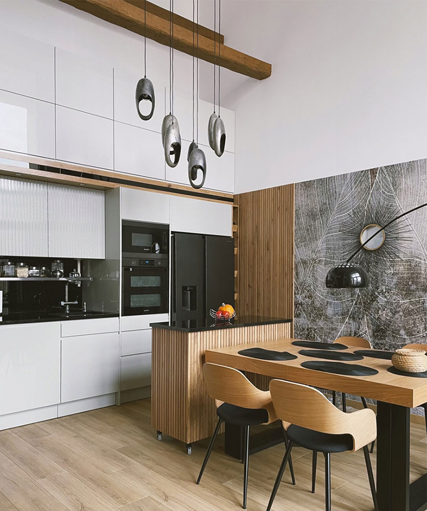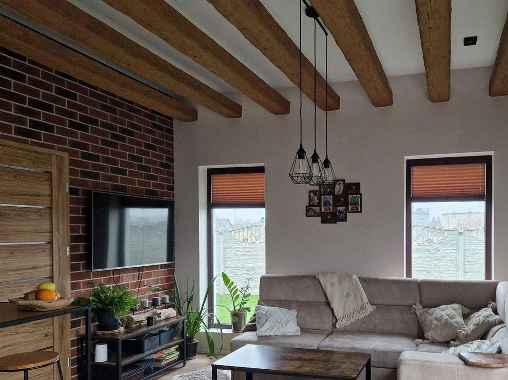 2. Modern en industrieel: In een modern of industrieel interieur kunnen houten balken gecombineerd worden met strakke lijnen, metalen accenten en minimalistische inrichting. Dit creëert een interessant contrast tussen de warme, natuurlijke uitstraling van hout en de koele, strakke materialen van modern design.